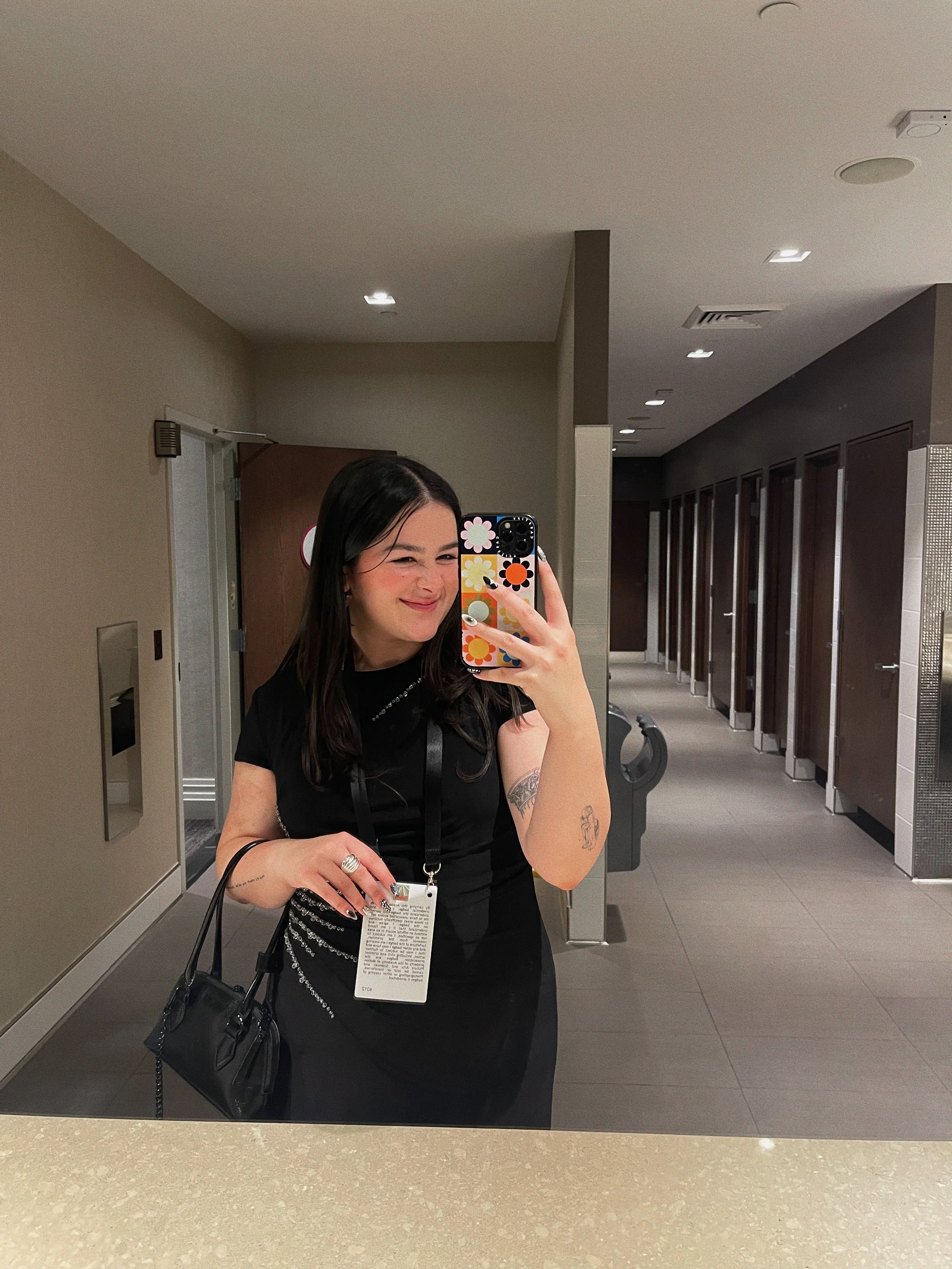 I dressed up — you only take a photo for your Oscar credential as a student journalist once (hopefully, I get to go back again someday)! My bag was, of course, my John Waters pink cockroach patterned puffy Baggu purse that I purchased from the Academy Museum (I should have worn my Nicolas Cage “Dream Scenario” pin that I got at the same time).