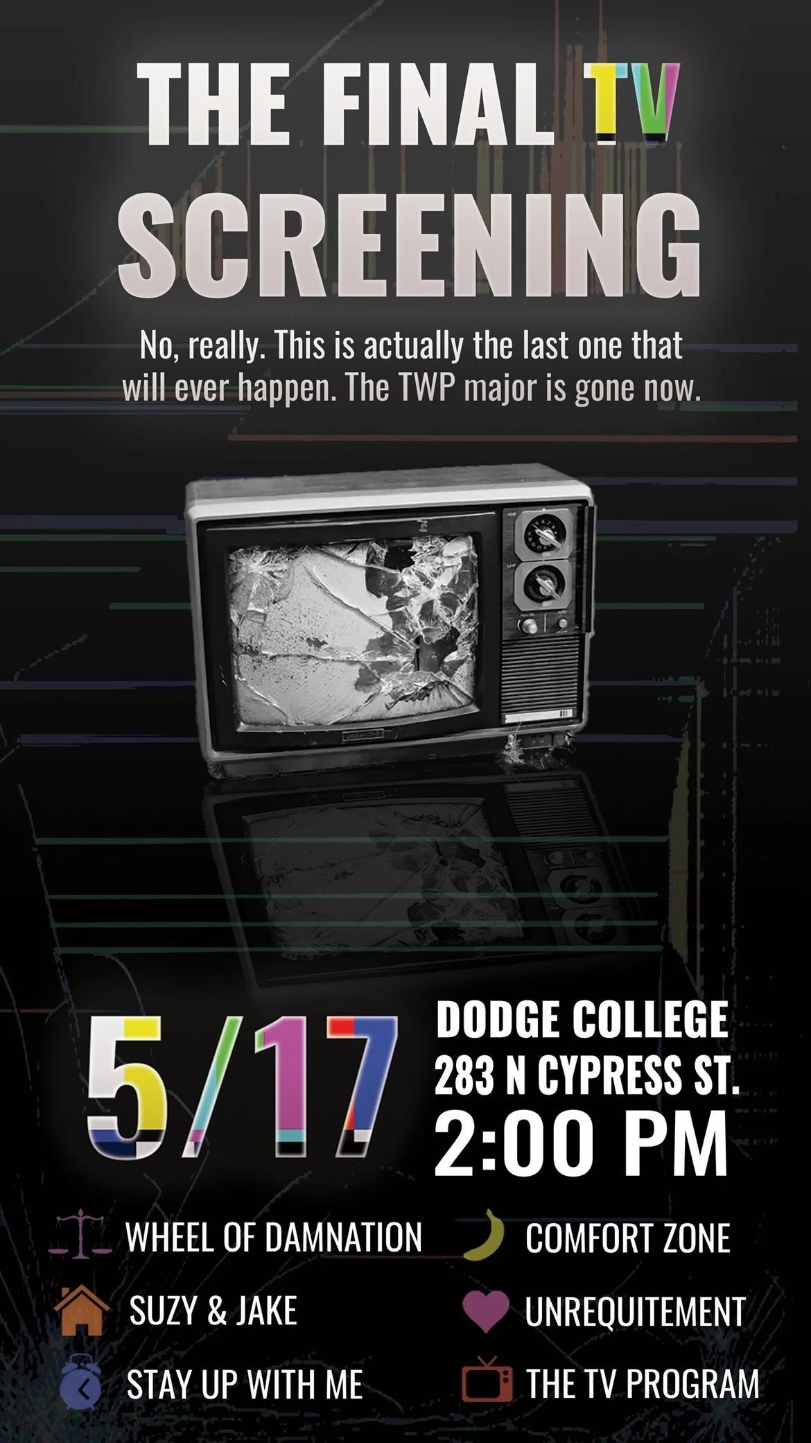 The final TWP short form screenings were held in the Folino Theater on Saturday, May 17. The screening showcased each of the six projects from Short Form Television I and II: “Wheel of Damnation,” “Suzy and Jake,” “Stay Up With Me,” “Comfort Zone,” “Unrequitement” and “The TV Program.”