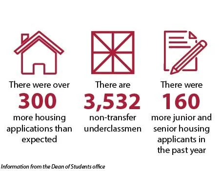 “First year students in particular benefit from living on-campus socially and academically,” Price said. “Returning students are more equipped in finding their own housing.” This year’s retention rate for the sophomore class went up from 90 to 93 percent, according to Price, which contributed to the lack of on-campus housing. The acceptance of 42 more transfer students than last academic year and an estimated 160 more juniors and seniors wanting to live in on-campus housing also tipped the scales.