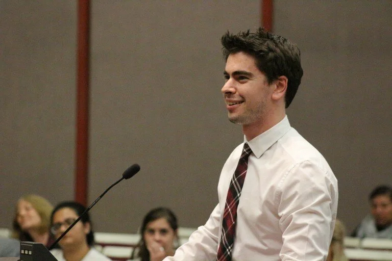 Adam Mann, a senior television and broadcast journalism major, addresses the Orange City Council March 8. Mann told the Council that a stricter party ordinance would further divide Chapman students and the community. Photo by Allie Camp