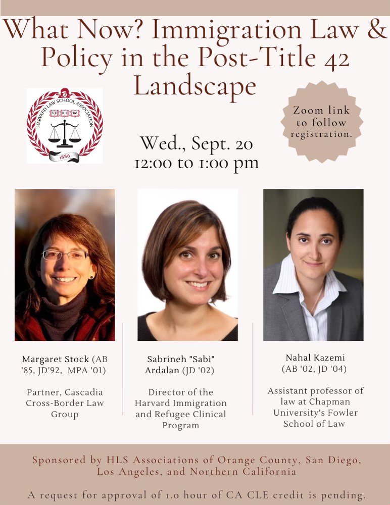 The webinar, hosted by assistant law professor Nahal Kazemi, featured guests from Cascadia Cross-Border Law Group and Harvard Immigration and Refugee Clinical Program. Flyer courtesy of Harvard Law School Association