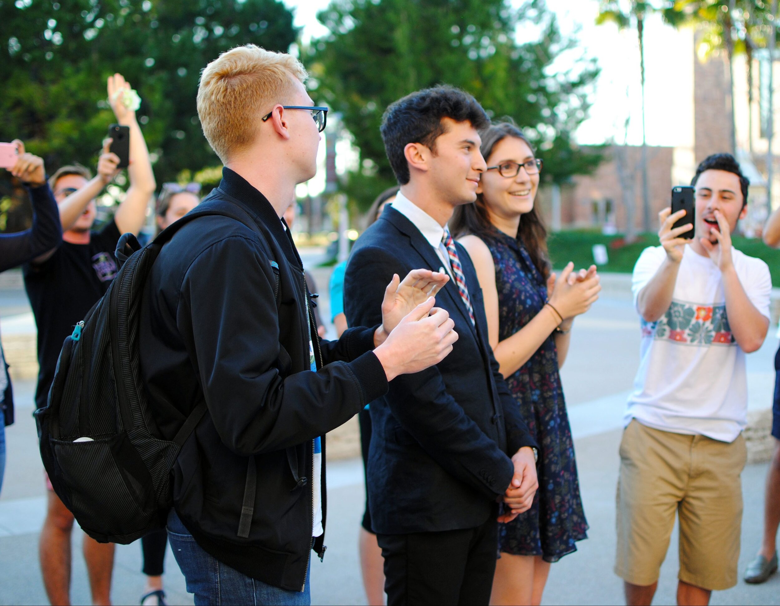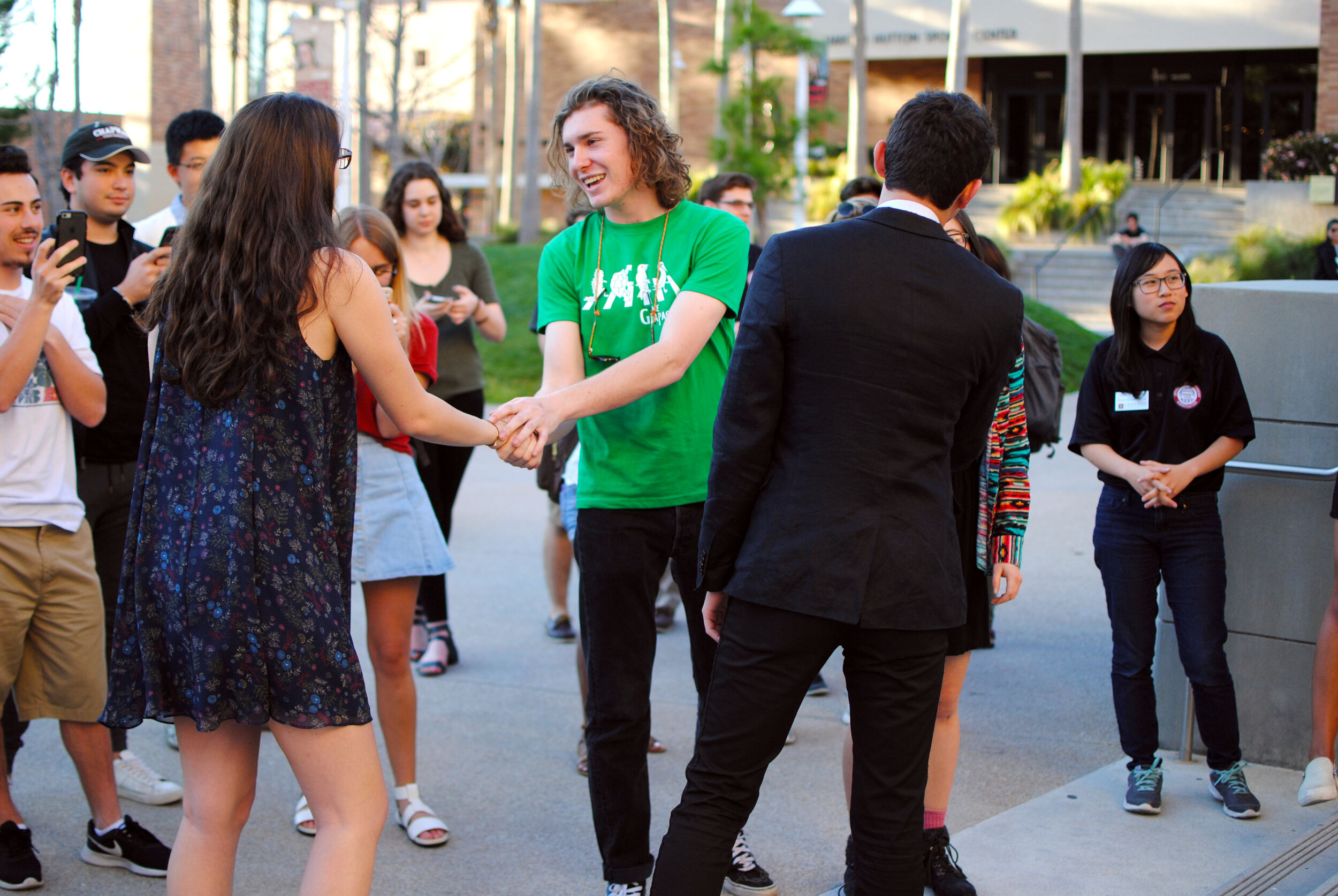 Speaker of Senate Mitchell Rosenberg and Junior Class Senator Sarah Tabsh shake hands with write-in candidates Lucas Bugbee and Maggie Mirrione. Photo by Bonnie Cash