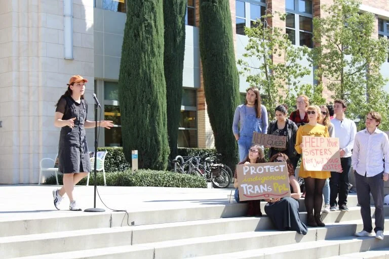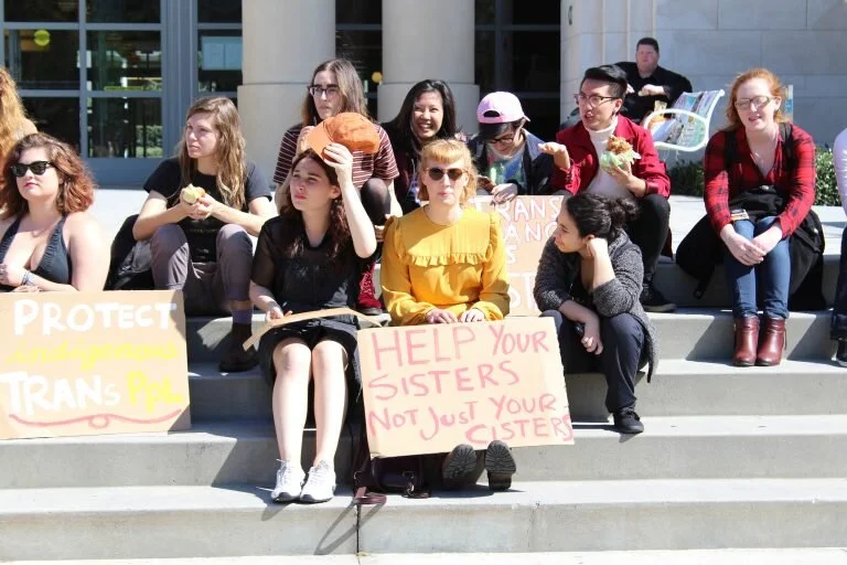 Students who attended the event held signs that read “Black trans lives matter,” “We’re here and we’re queer” and “Protect indigenous trans people.”