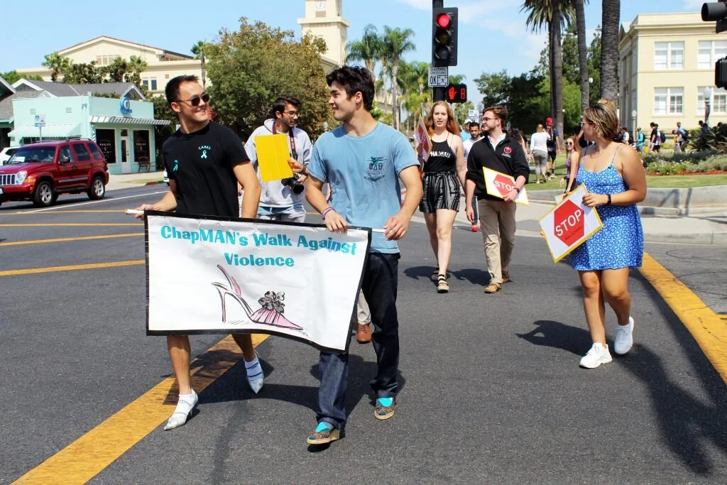 Students walked from campus to the Orange Plaza. Some held signs that read “Caution: Men in heels.”