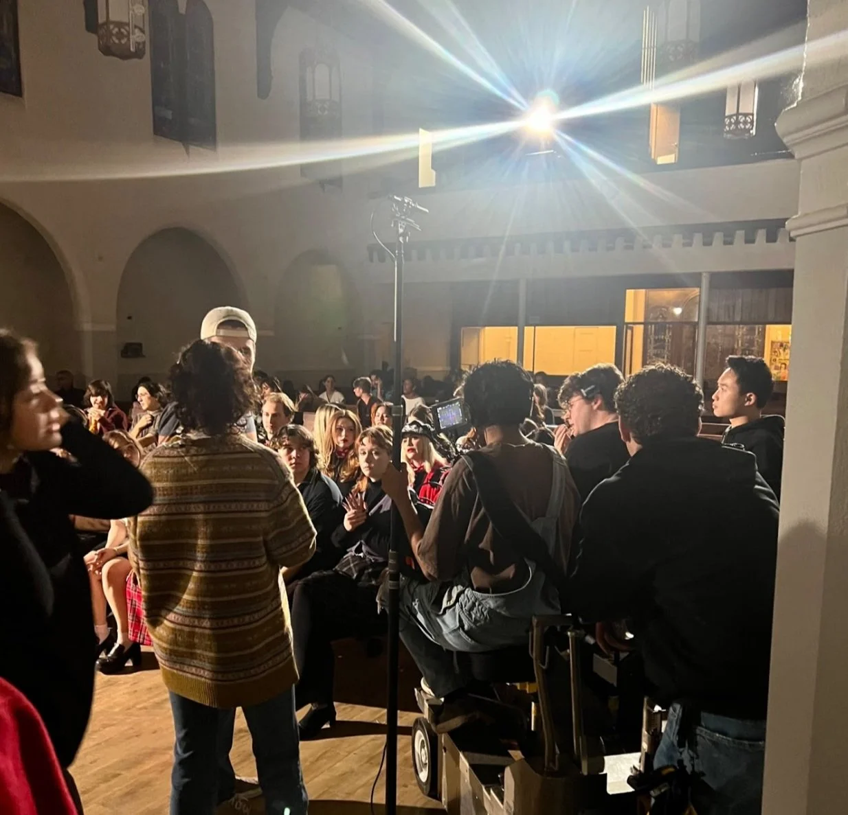 “Los Angles” Dodge College Virtual Production Thesis behind the scenes of talent show extras preparing for a shot in a church location—one of the largest groups of extras I have seen on set!