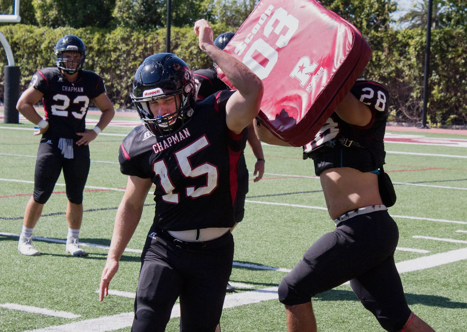 On Sept. 21, the Chapman football team’s starting lineup will run out under Wilson Field’s stadium lights for the very first home game of the season, accompanied by cheers from fellow students and families. But those sitting in the crowd may not have much of a clue as to the amount of preparation the players, tensed at the line of scrimmage, have gone through during preseason training. Training camp, as a football team’s preseason is commonly known, requires players to be “locked in” every single day, sophomore linebacker Duncan Heger said.