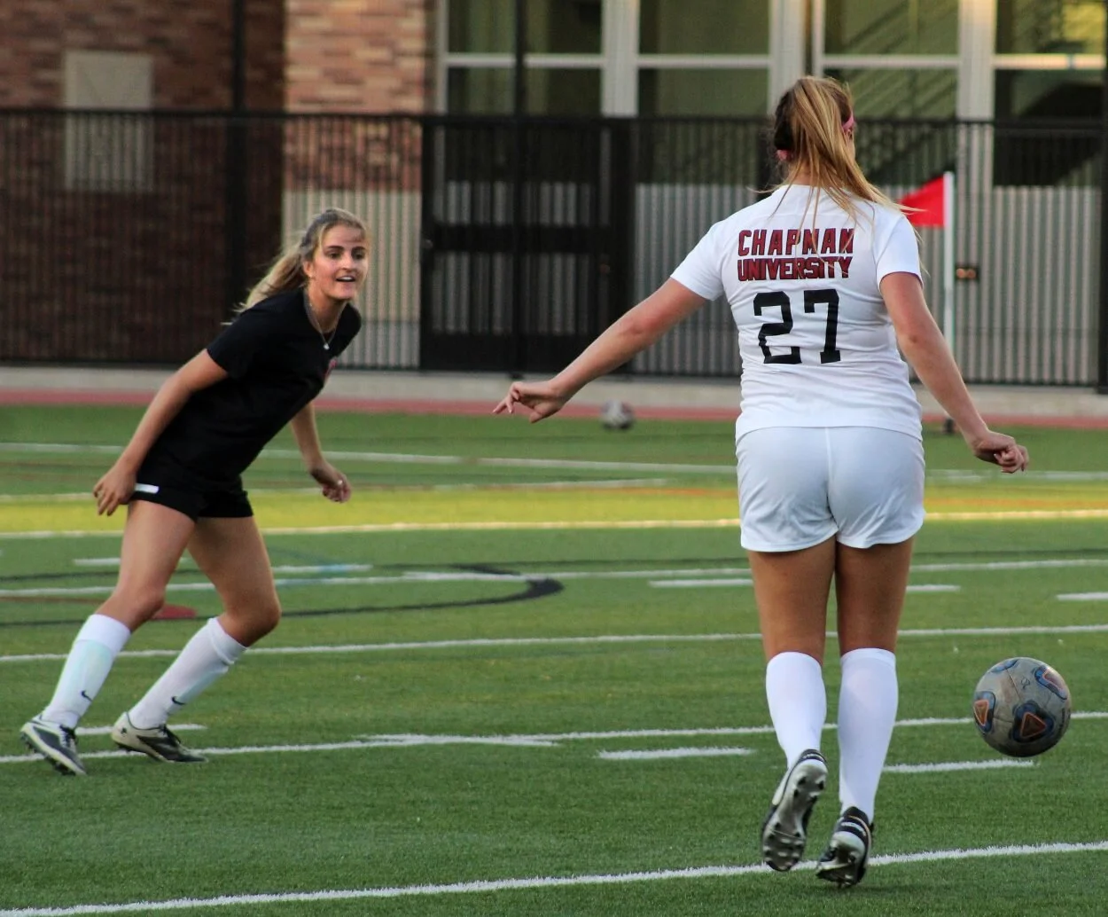 Visibly tired, Haley Fedden trudged toward the bench on the sidelines under the lights of Wilson Field. As she neared, she looked at the cluster of fellow Chapman women’s soccer alumni standing off the field. She grinned and extended her arm, gesturing in a thumbs-up.