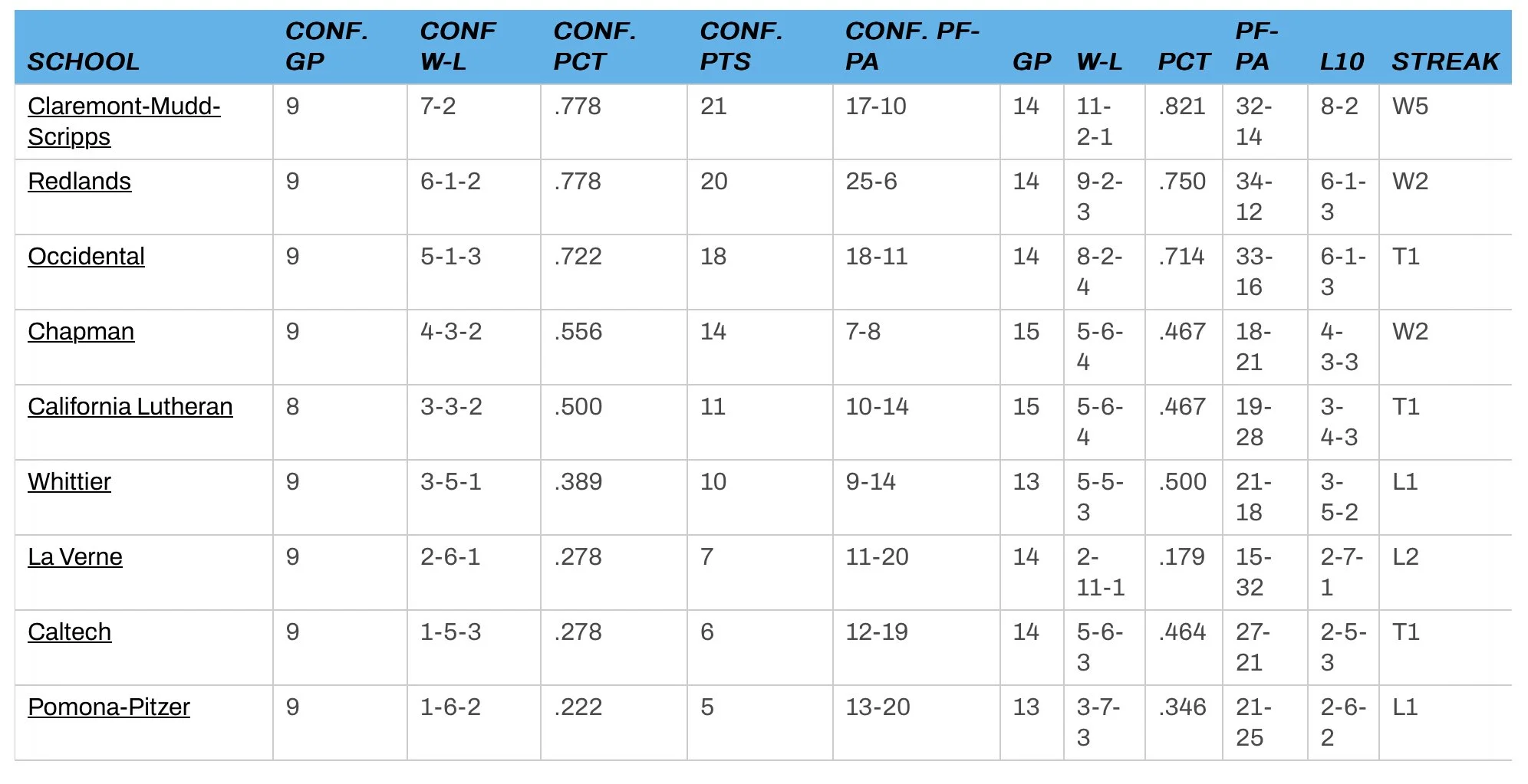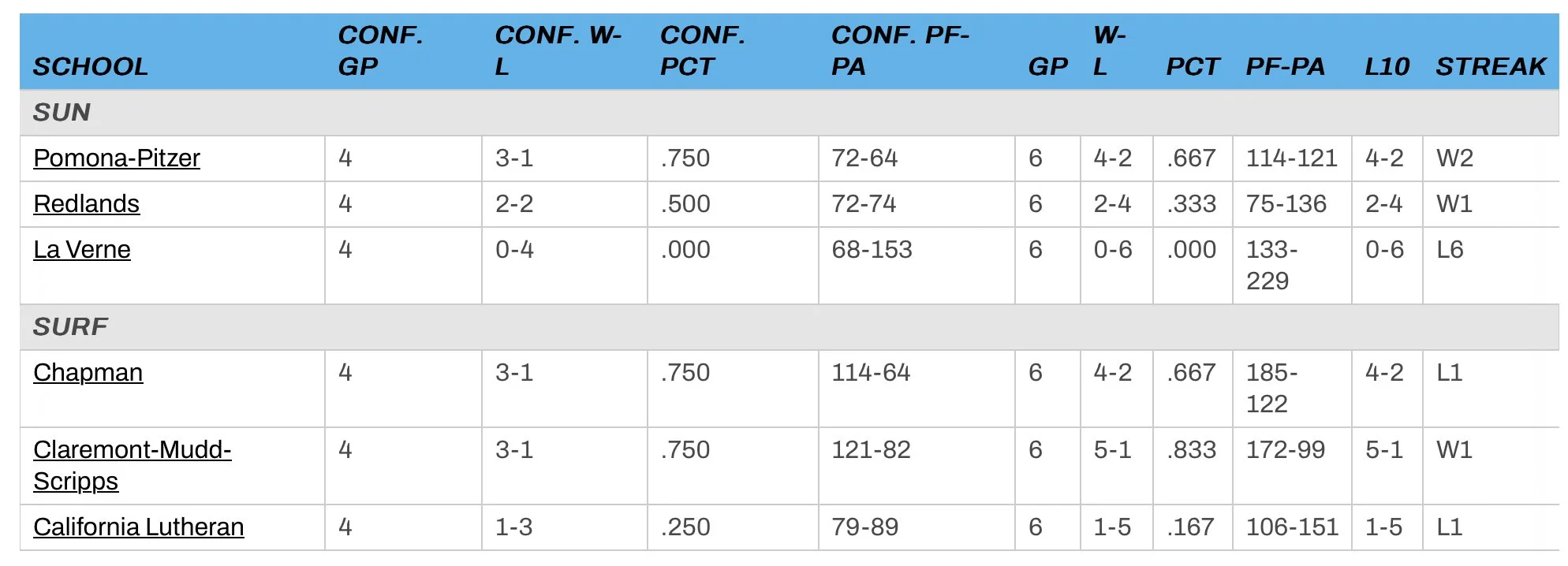 This is the only sport with a different playoff structure, as only six schools have football teams in the conference. There are two divisions of three teams, the Sun and Surf, and the regular season leader for both of those will play in the championship game. Currently Chapman sit tied first in the Surf division with Claremont-Mudd-Scripps colleges, but hold the tiebreaker after beating CMS earlier this season.